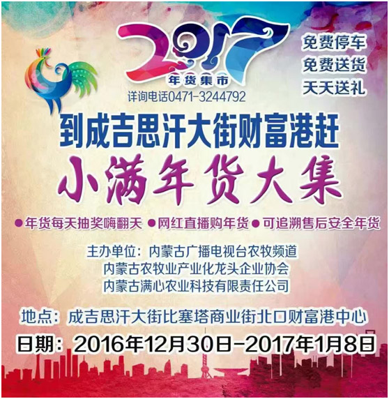 1230日,經(jīng)過(guò)精心籌備策劃的內(nèi)蒙古廣播電視臺(tái)農(nóng)牧頻道小滿年貨大集終于精彩亮相青城與廣大市民群眾見(jiàn)面了。年貨大集現(xiàn)場(chǎng),140家參展企業(yè)上千種產(chǎn)品競(jìng)相亮相,本次活動(dòng)由內(nèi)蒙古農(nóng)牧業(yè)產(chǎn)業(yè)化龍頭企業(yè)協(xié)會(huì)攜手內(nèi)蒙古廣播電視臺(tái)農(nóng)牧頻道和內(nèi)蒙古滿心農(nóng)業(yè)科技有限責(zé)任公司共同打造,搭建一個(gè)展示企業(yè)形象、宣傳地方產(chǎn)品、溝通產(chǎn)銷渠道、擴(kuò)大消費(fèi)需求、活躍節(jié)日市場(chǎng)的經(jīng)濟(jì)平臺(tái),營(yíng)造溫馨舒適、品種齊全、質(zhì)優(yōu)價(jià)廉、安全可靠、熱鬧紅火的節(jié)日購(gòu)物氛圍,讓全區(qū)老百姓不用東奔西走就能購(gòu)買到內(nèi)蒙古的新鮮蔬菜、瓜果、乳肉、糧油等特色農(nóng)畜產(chǎn)品,采購(gòu)到豐富的鄉(xiāng)土年貨、進(jìn)口食品、日用副食等,豐富首府百姓的菜籃子。