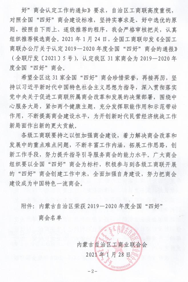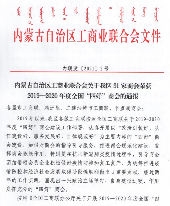 標題:喜報!內(nèi)蒙古農(nóng)牧業(yè)產(chǎn)業(yè)化龍頭企業(yè)協(xié)會榮獲全國“四好”商會榮譽稱號