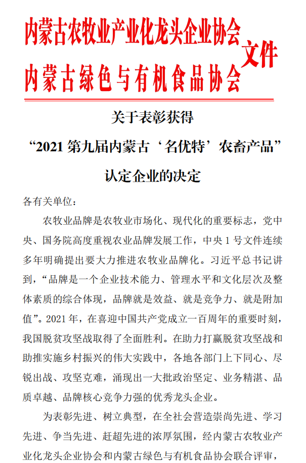 標題:關于表彰獲得 “2021第九屆內(nèi)蒙古‘名優(yōu)特’農(nóng)畜產(chǎn)品”認定企業(yè)的決定