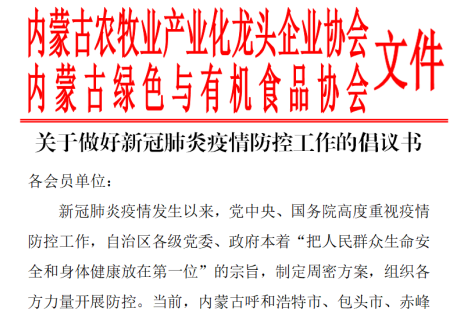 一、內(nèi)蒙古農(nóng)牧業(yè)產(chǎn)業(yè)化龍頭企業(yè)協(xié)會(huì)聯(lián)合內(nèi)蒙古綠色與有機(jī)食品協(xié)會(huì),發(fā)布了《關(guān)于做好新冠肺炎疫情防控工作的倡議書》,引導(dǎo)各會(huì)員單位堅(jiān)決遏止借機(jī)囤積居奇、哄抬物價(jià)、虛假宣傳等破壞市場(chǎng)秩序、損害消費(fèi)者合法權(quán)益的不法行為,堅(jiān)決遏制疫情擴(kuò)展蔓延,積極投身新型冠狀病毒防控戰(zhàn)役中。