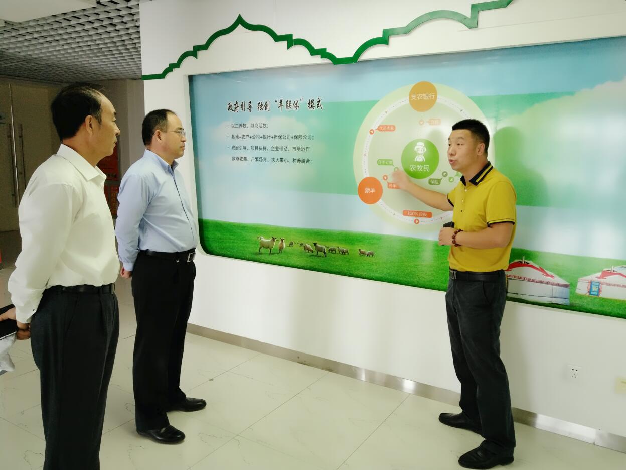 調(diào)研組一行首先參觀協(xié)會會長單位羊牧業(yè)股份有限公司,在聽取協(xié)會會長、蒙羊牧業(yè)副董事長閆樹春的介紹后,調(diào)研組一行詳細(xì)了解了蒙羊的“生產(chǎn)鏈”和“羊聯(lián)體”模式,并指出“羊聯(lián)體”模式是一種很好的模式,企業(yè)發(fā)展帶動(dòng)農(nóng)牧戶致富,并由企業(yè)出資擔(dān)保農(nóng)牧戶,降低銀行、保險(xiǎn)的風(fēng)險(xiǎn),這種模式既新穎又可控風(fēng)險(xiǎn)。調(diào)研組一行表示,今后銀行等各類金融機(jī)構(gòu)可以加大參與力度,讓金融資本更大程度上的支持內(nèi)蒙古農(nóng)牧業(yè)發(fā)展。