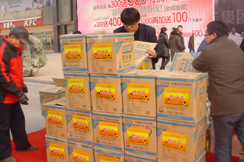 捐款現(xiàn)場(chǎng)的慰問品區(qū)