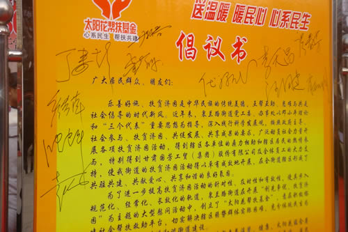 與會(huì)領(lǐng)導(dǎo)分別在太陽花幫扶基金倡議書簽名,倡議大家都能有樹立助人為樂、助人為榮的觀念