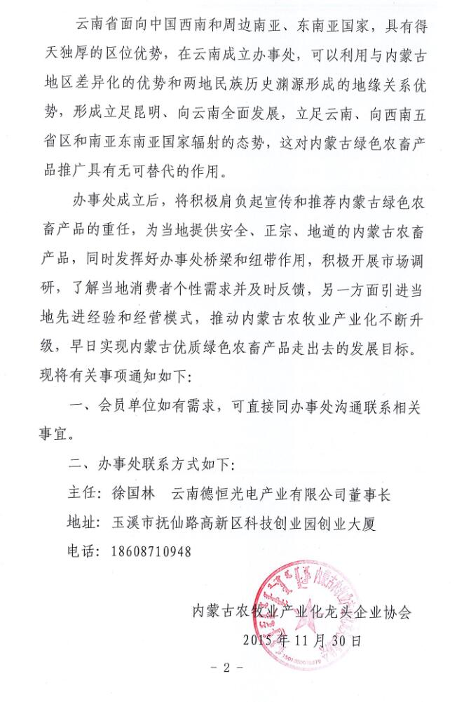 關于成立內(nèi)蒙古農(nóng)牧業(yè)產(chǎn)業(yè)化龍頭企業(yè)協(xié)會云南辦事處的通知