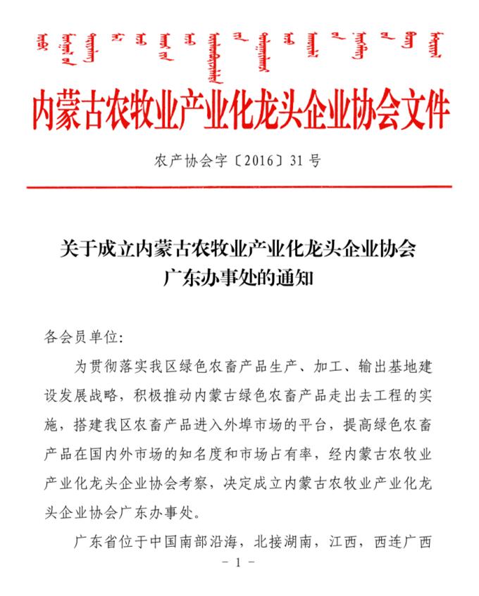 關(guān)于成立內(nèi)蒙古農(nóng)牧業(yè)產(chǎn)業(yè)化龍頭企業(yè)協(xié)會廣東辦事處的通知